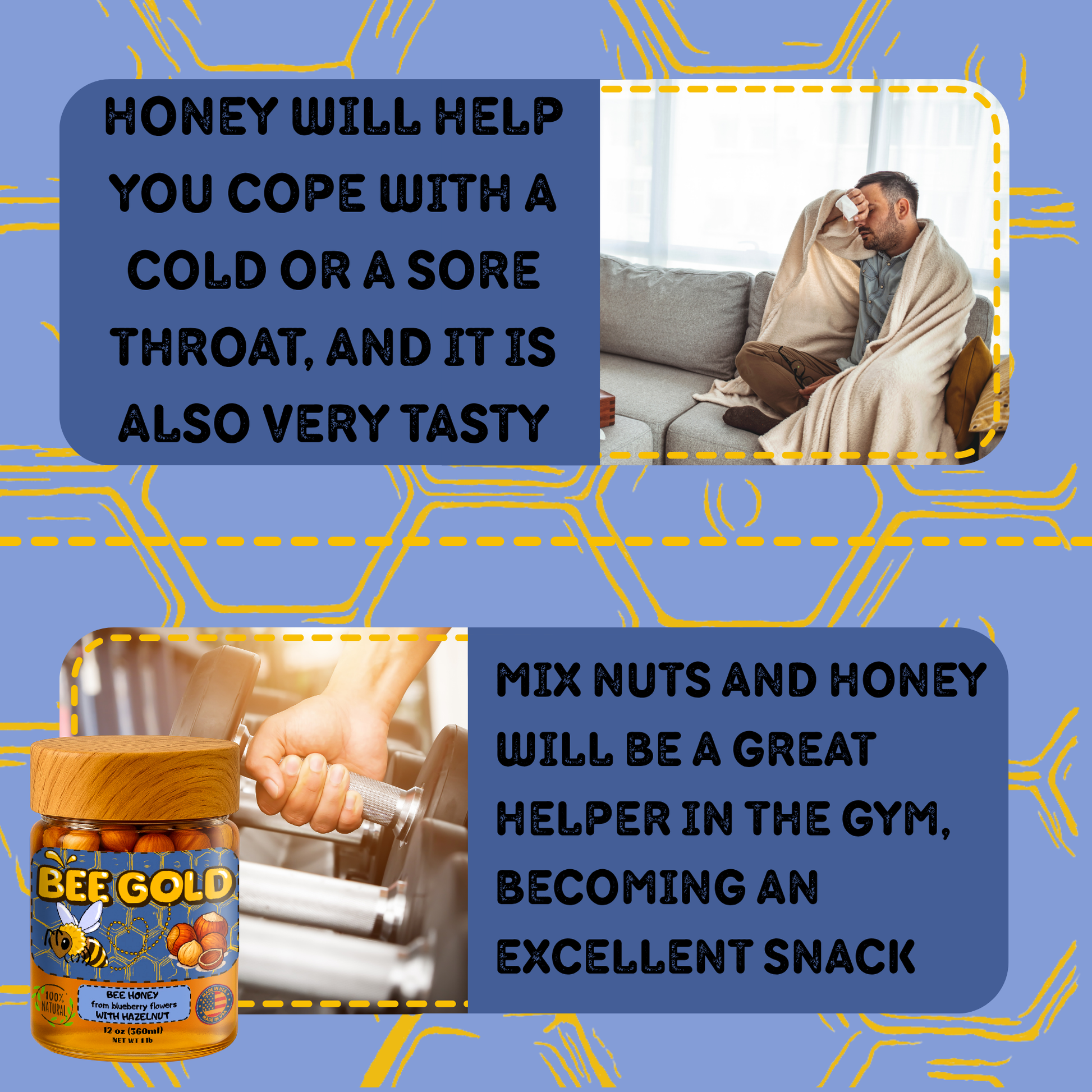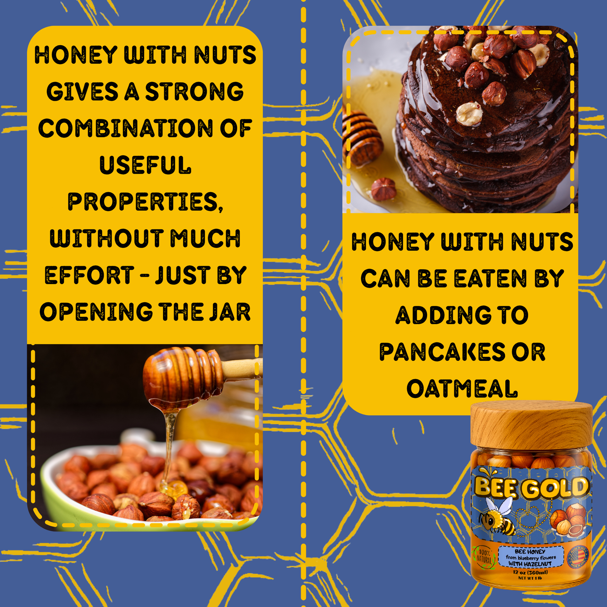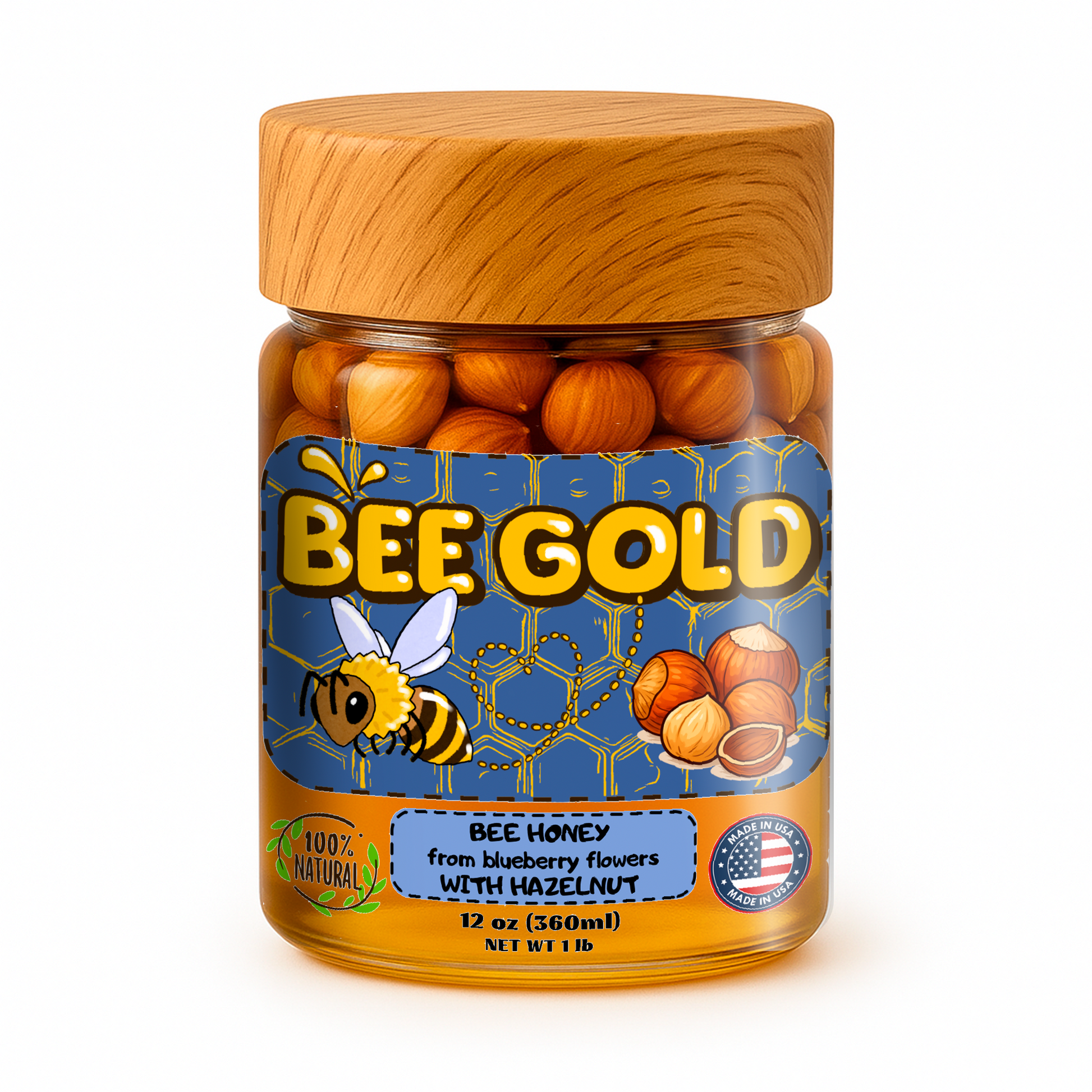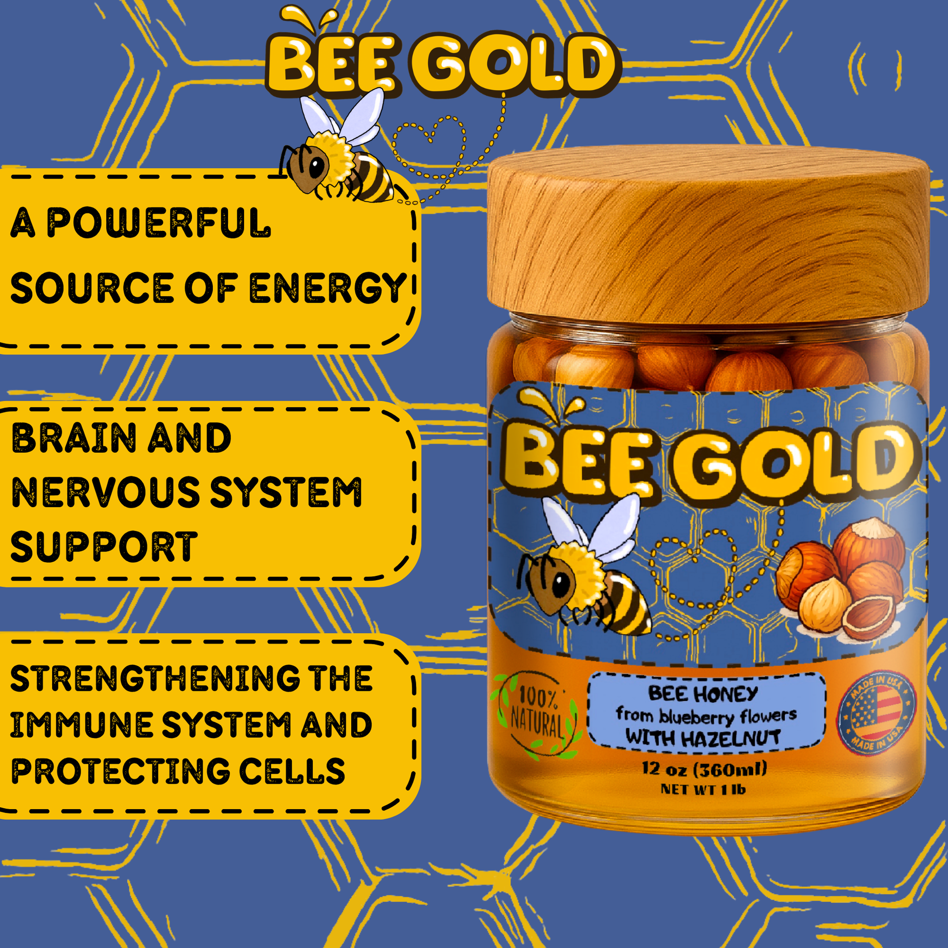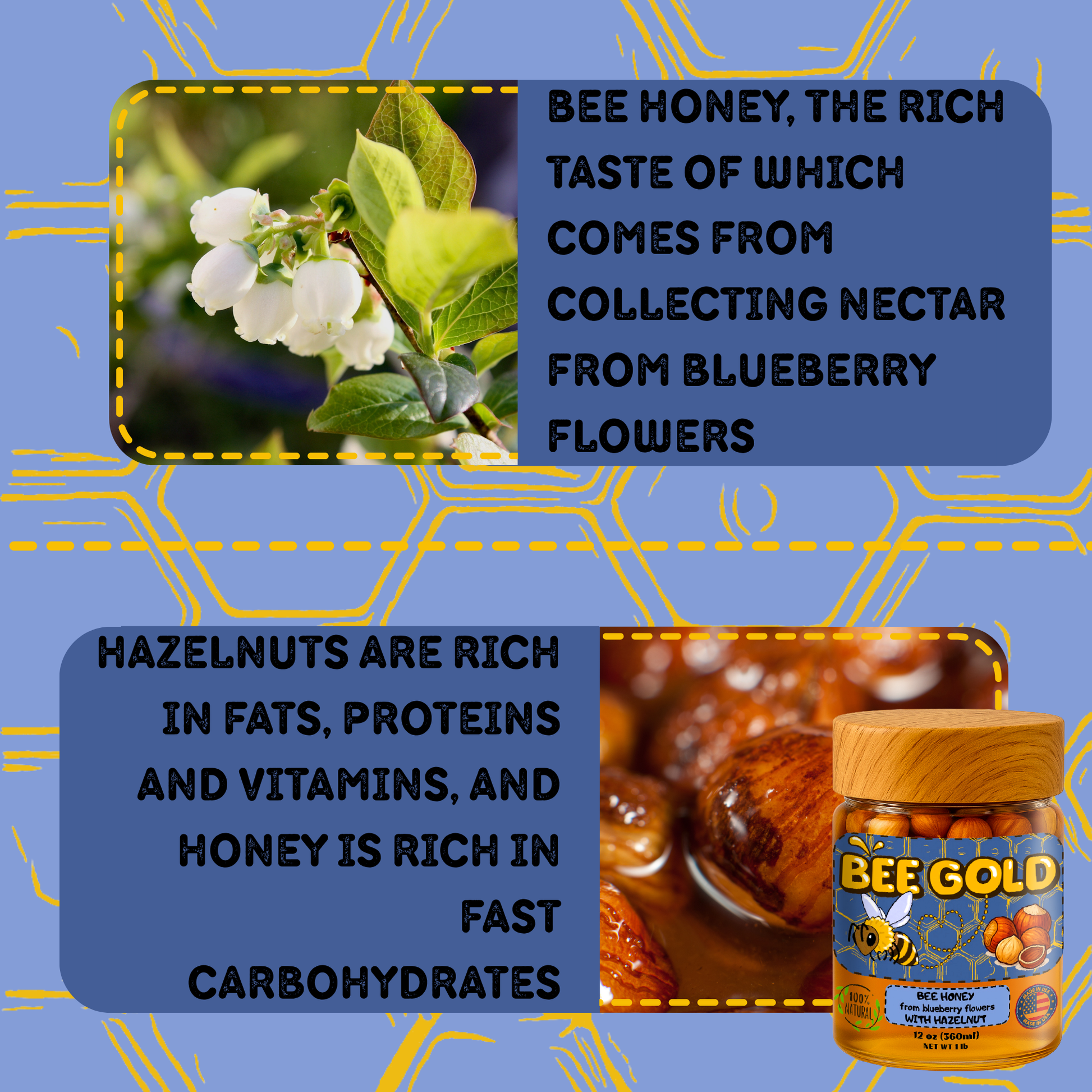 Bee Gold – Raw Blueberry Blossom Honey with Hazelnuts | Gourmet Nut Spread | Clean Ingredients | Supports Active Lifestyles | Unfiltered Honey Nut Spread | No Added Sugar | 12 oz